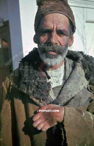 Russian farmer in traditional hat and winter jacket, Russian front. 1944.