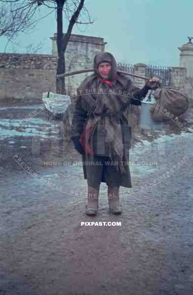 Russian farmer women carrying food and water through Russian village 1943. Photographed by german war photographer.