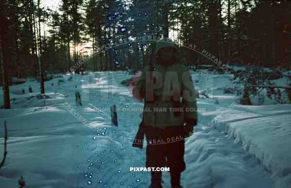 Russian forest, winter snow 1943 Russia, German infantry in white snow camo uniform and helmets, 207th Infantry Division