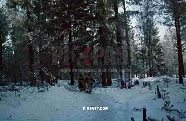 Russian forest, winter snow 1943 Russia, German infantry in white snow camo uniform and helmets, 207th Infantry Division