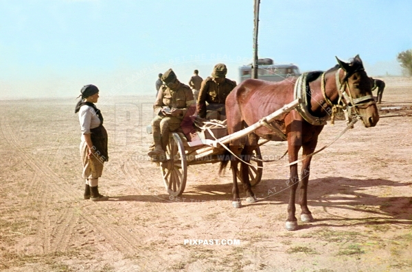 Russian military translator with white Wehrmacht Dienst arm band helping translating between soldier and Russian farmer.