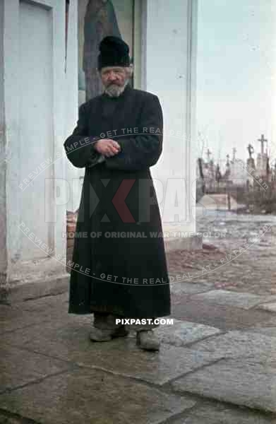 Russian Orthodox priest in front of Church and graveyard, Russia 1942, Taken by German war reporter.