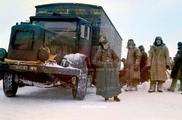Russian POW prisioners digging MAN type F 4 heavy transport truck out of snow. Crimea Krim winter 1943