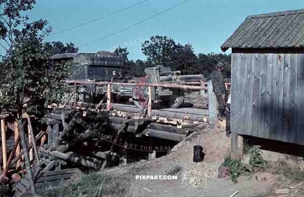 SdKfz 6 half-track with 10.5 cm leFH 18 Artillery Cannon over wooden war bridge, 3rd Panzer Division, Beresina 1941.