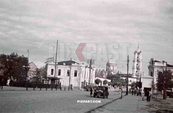 Soborna street and Spaso-Preobrazhenski cathedral in Sumy, Ukraine ~1941