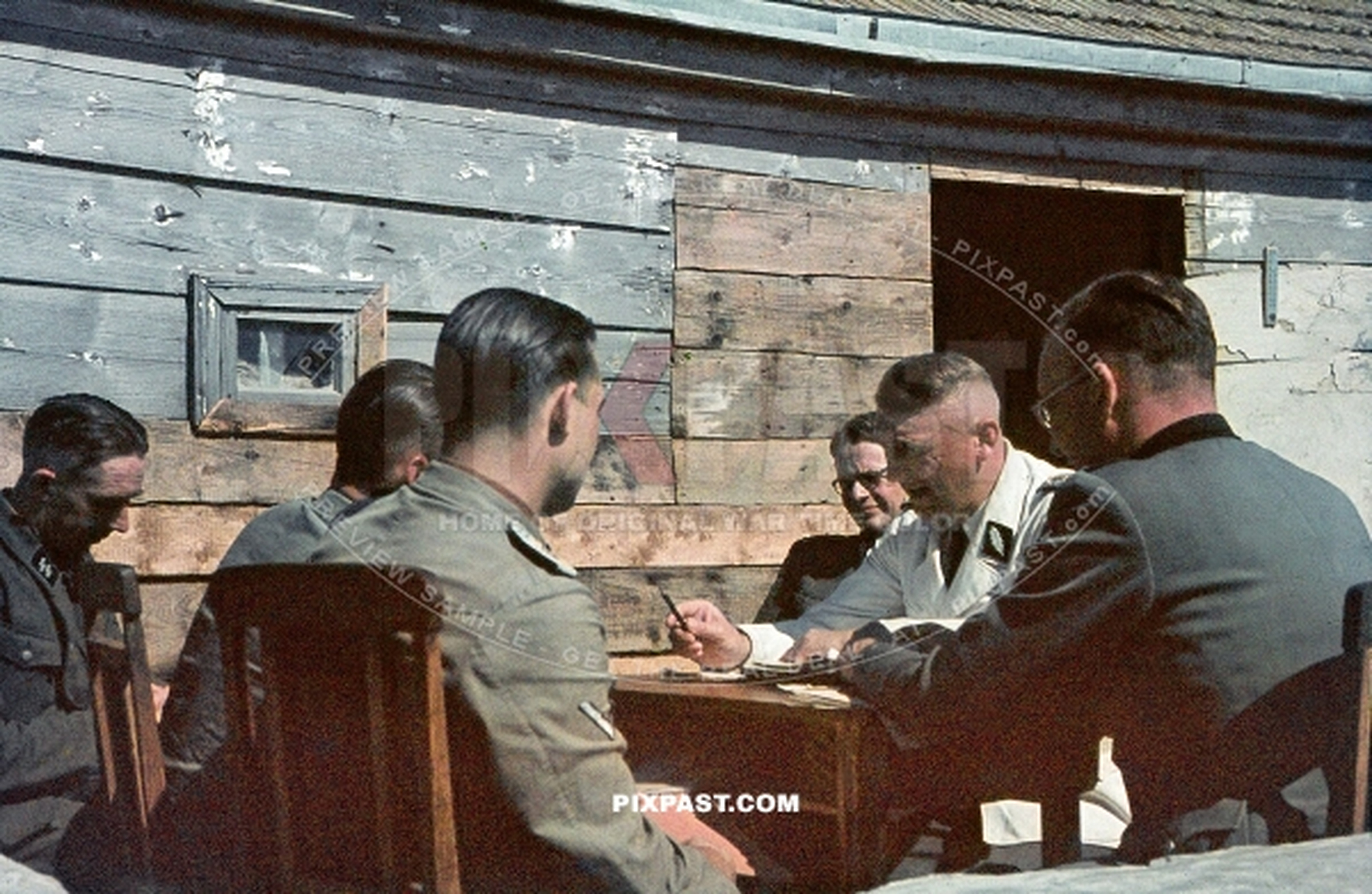 Special German officers have strategy meeting beside wooden hut. Ukraine 1943