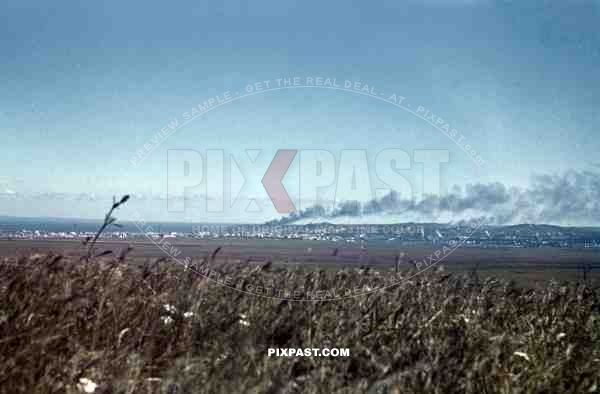 Sudak Bay below the genoese fortress in Crimea, Ukraine 1942, burning houses, 22nd Panzer Division.