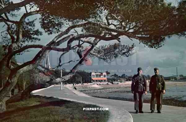 Two german infantry soldiers walking on beach strand coast fishing harbour La Rochelle France 1940