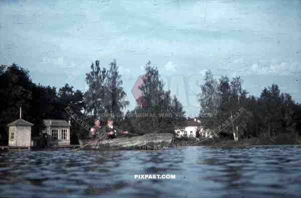 Two german soldiers in rowing boat, lake, 10th Motorised infantry division repair werkstatt Bryansk 1941
