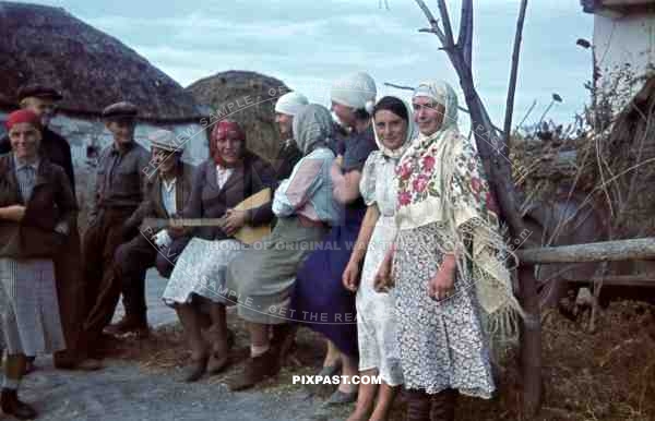 Ukrainian farming peasants in full costume greet German soldiers, Krim, Kretsch, 1942