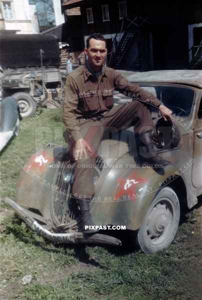 US Army officer of the 101ST CAVALRY REGIMENT. Sitting on a captured Germany army car Peugot 202. Schwendt Austria 1945
