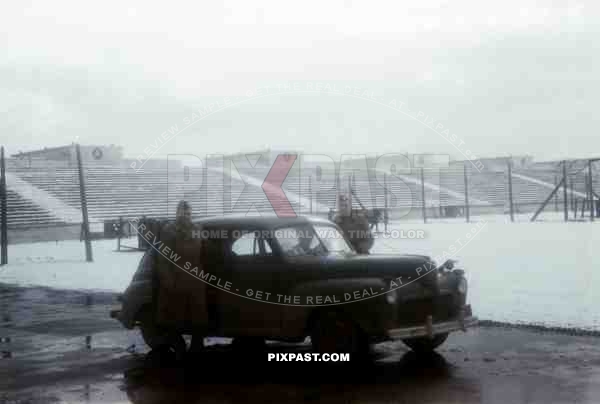 US officers with Sedan Ford Light 1941 Model Staff Car, Soldiers Field, US Army captured Nuremberg Rally field 1945.