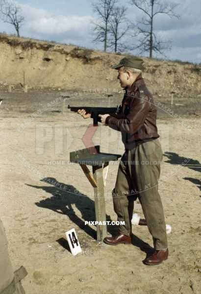 USAAF pilot trains with Thompson submachine gun in MacDill Field, Florida 1942. 322nd Bombardment Squadron Medium.