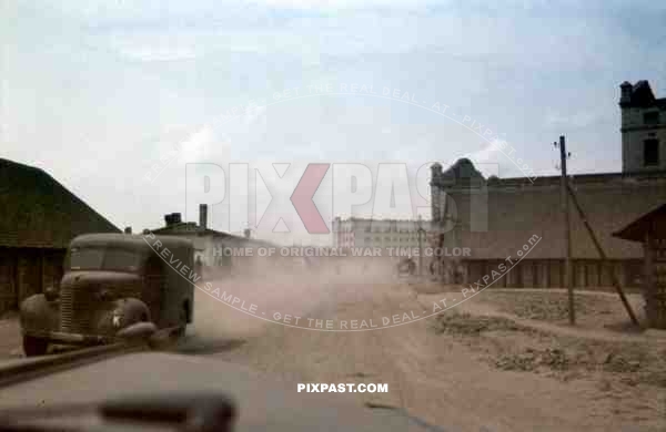 Ustiluh, Ukraine, Summer 1941, German Radio Car drive through dusty village, 94th Infantry Division.
