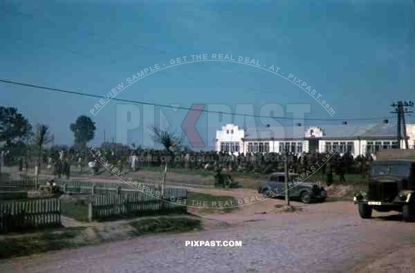 Ustiluh, Ukraine, Summer 1941, Invasion, Partisanen, Schulgebäude, School house, 94. Infantry Division, Signal corp, Summer 1941, POW camp, POW, Prisoners of War, barbed wire, kradmelder, motorbike, messenger, staff car, truck, graveyard, Tatra, truck, Mercedes ,170V,