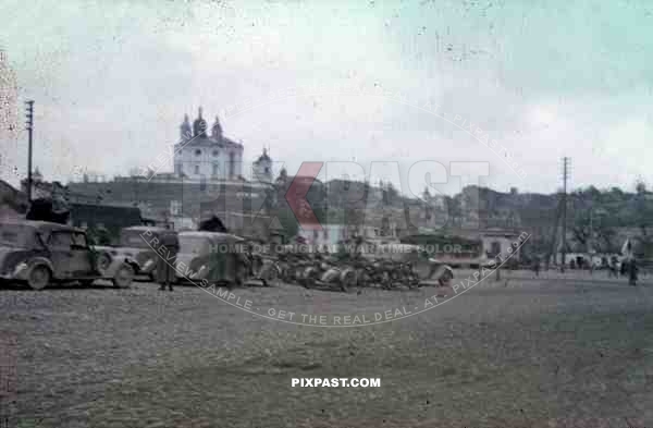 Wehrmacht convoy in front of the Smolensk cathedral, Russia ~1941