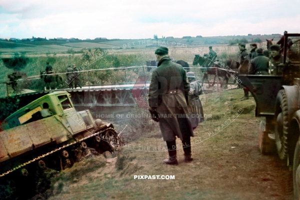 Wehrmacht crossing pontoon bridge. Smolensk 1941. Horch 901 jeep and Russian Komintern 1933 Heavy Artillery Tractor