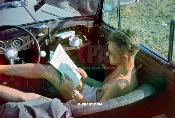 Wehrmacht infantry officer reading newspaper in Opel staff car. Near Stalingrad 1942 summer. 297 Infantry Division. Russia 1942