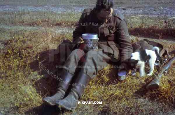Wehrmacht soldier feeding a stray dog, Russia 1944