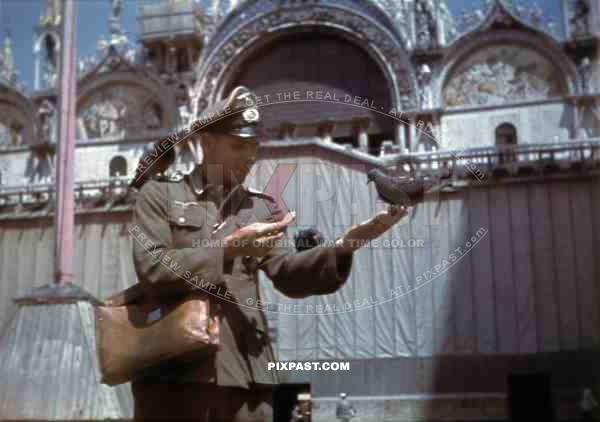 Wehrmacht soldier feeding pigeons in Venice, Italy 1943