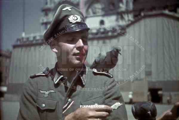 Wehrmacht soldier feeding pigeons in Venice, Italy 1943