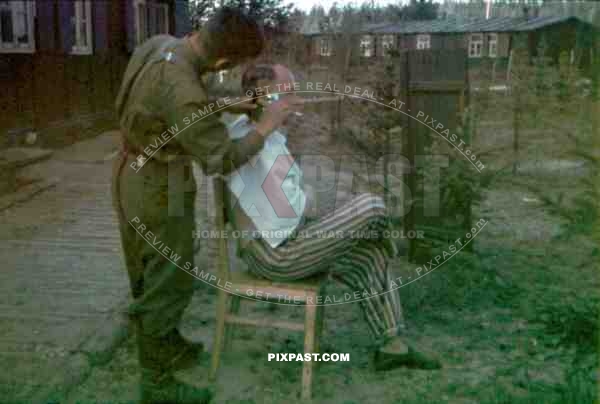 Wehrmacht soldier gets a haircut at the R.A.D. camp in Mitschurino, Russia 1941