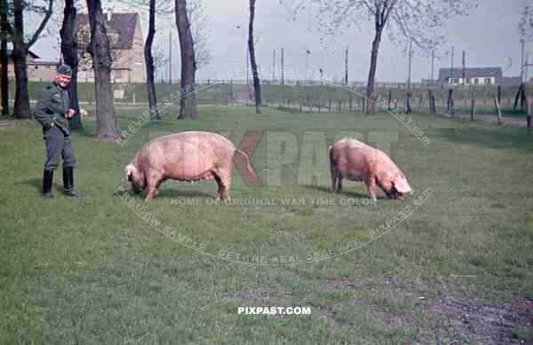 Wehrmacht soldier with pigs in Niederaußem, Germany 1940