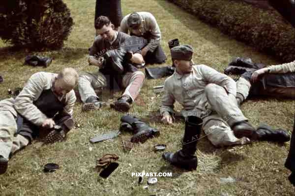 Wehrmacht soldiers of the IR 103 polishing shoes in Bautzen, Germany 1939