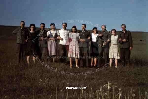 Wehrmacht soldiers posing with local girls in Lidzbark Warmiski (near Heilsberg), Poland ~1942. 207. Infantry Division.