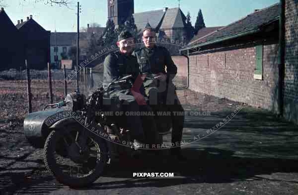 Wehrmacht soldiers with motorbike in Niederaussem Von-Galen-Weg, Germany 1940
