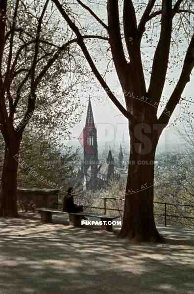 woman on a bench looking over Freiburg and the cathedral, Germany 1939