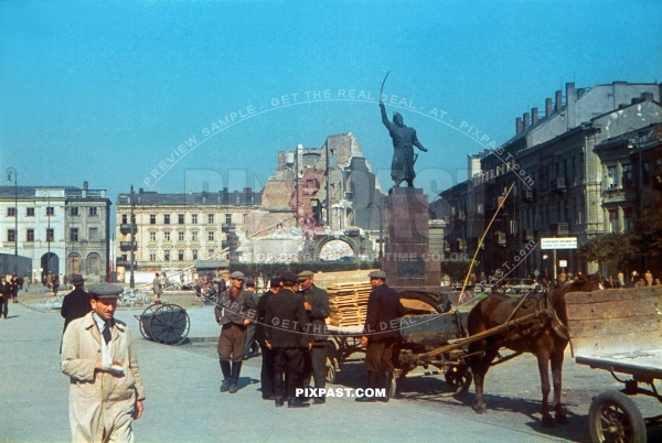 Wounded polish man and street cleaners removing rubble from the market. Jan Kilinski Monument, Warsaw Poland 1939