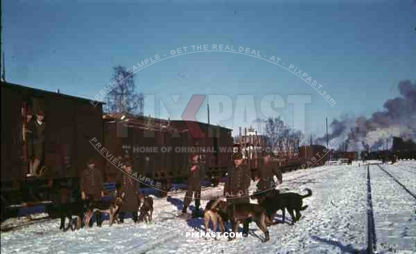 WW2 color Finland 1945 German Wehrmacht dog security train group locomotive station Hundestaffel