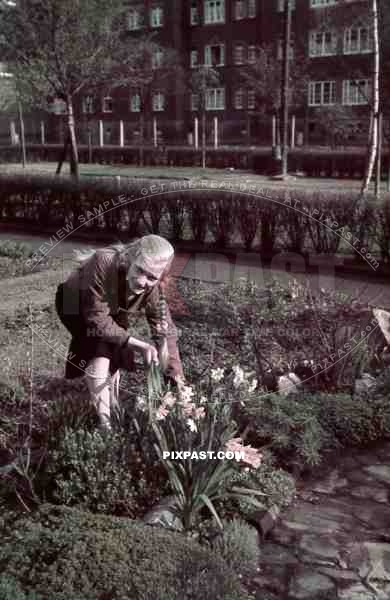 WW2 Color German Hitler Youth BDM girl in uniform flowers Bremerhaven apartment building garden