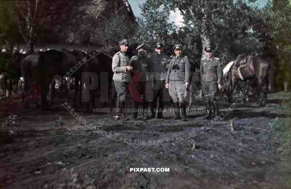 WW2 Color German Wehrmacht army Cavalry officers with horses in Ukraine town 1943 Binoculars