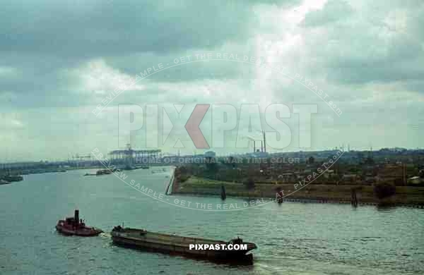 WW2 Color Hamburg Harbour Germany 1940 Tug Boat Transporter Cranes ship building yard coal