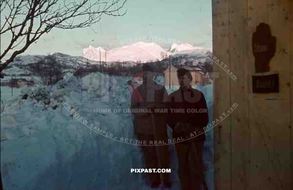 WW2 Color Norway 1940 2 German soldiers cleaning toilets snow winter gloves