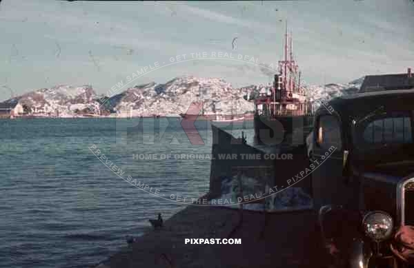 WW2 Color Norway 1940 Cargo Fishing Boats Ships supply harbour snow tractor truck
