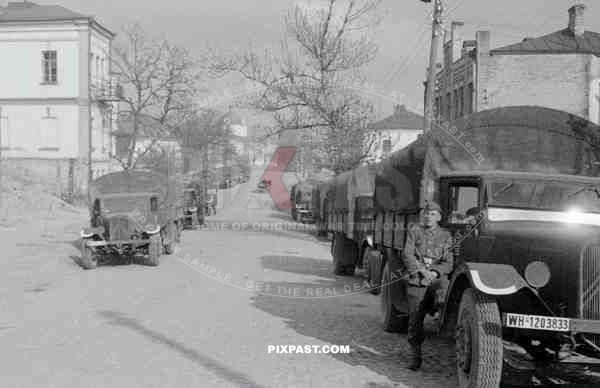 WW2 color Russia summer 1942 austrian supply truck column wehrmacht town