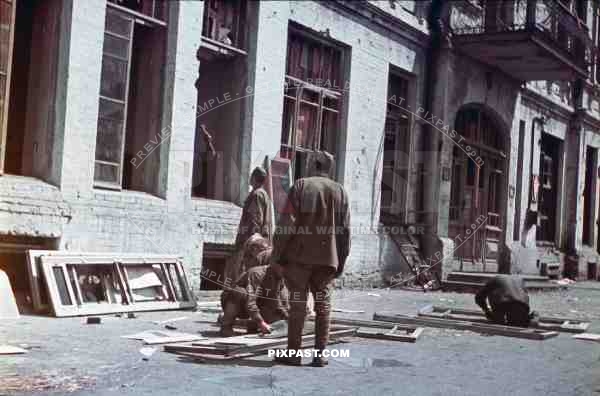 WW2 Color Ukraine Kharkov Russian military POW soldiers repair windows in captured government building for germans