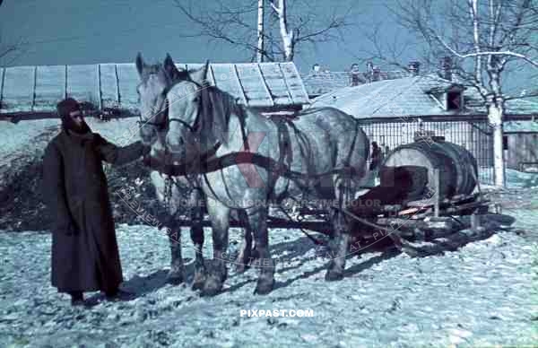 WW2 Colour Ukraine German Wehrmacht soldier with horse and supply sled winter