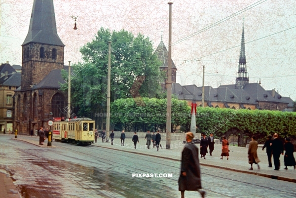 Yellow Number 2 Tram Strassenbahn passing St. Johann Baptist Church in Essen Germany 1941. Bomb monument red fin.