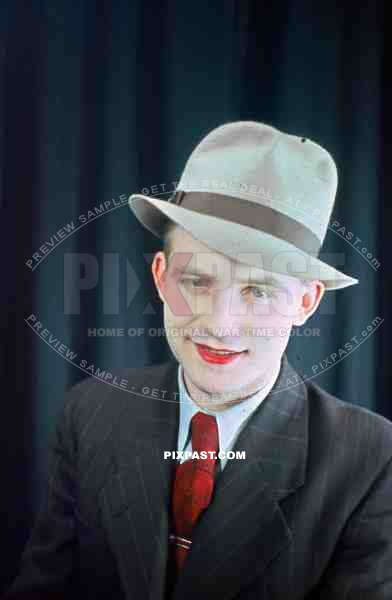 Young Austrian man in American style 20s hat and jacket with red lipstick, theatre show 1937, Later becomes war reporter.