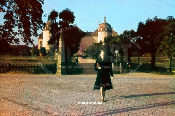 Young German lady standing with red hand bag in front of Schloss Moritzburg Saxony Germany 1942