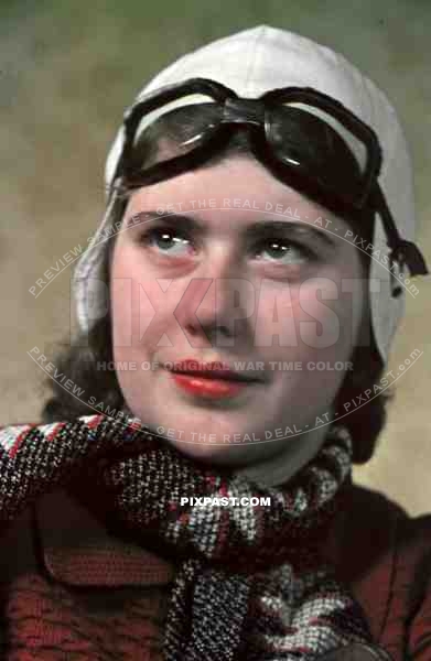 Young german woman Berlin 1940 wearing flying / driving goggles and white leather helmet