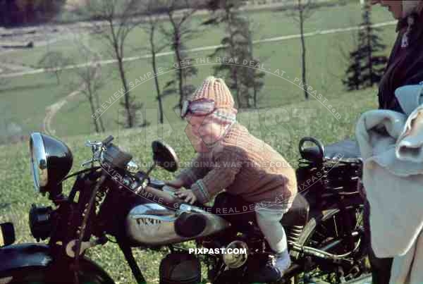 Young little child playing on a pre war NSU motorbike in Garmisch Partenkirchen Germany 1938
