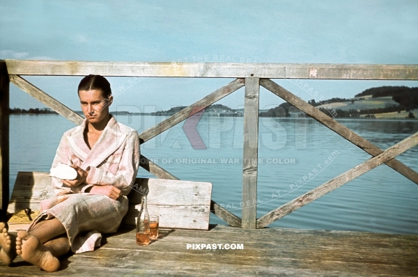Young man eating sandwich and bottle of beer on Bodensee Lake Constance in medieval town Meersburg 1940