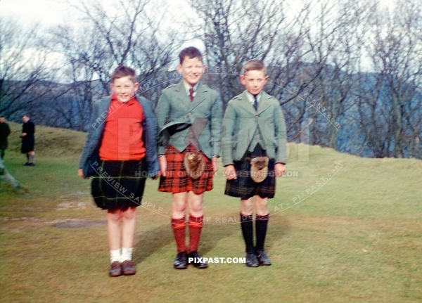 Young man Ian Miller standing with his friends in traditional Scottish kilt near Edinburgh Scotland. War time 1944