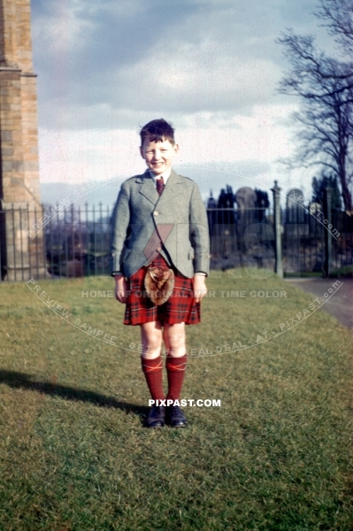 Young man Ian Miller standing with his friends in traditional Scottish kilt near Edinburgh Scotland. War time 1944