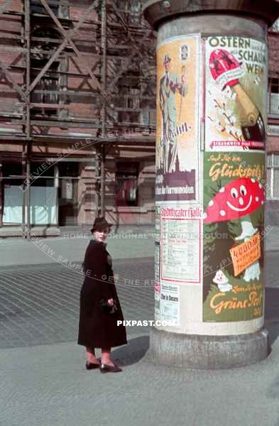 Young women reading posters on a Advertising column. Litfasssaule. for the Halle Saale Theatre ( Saxony-Anhalt ) 1940